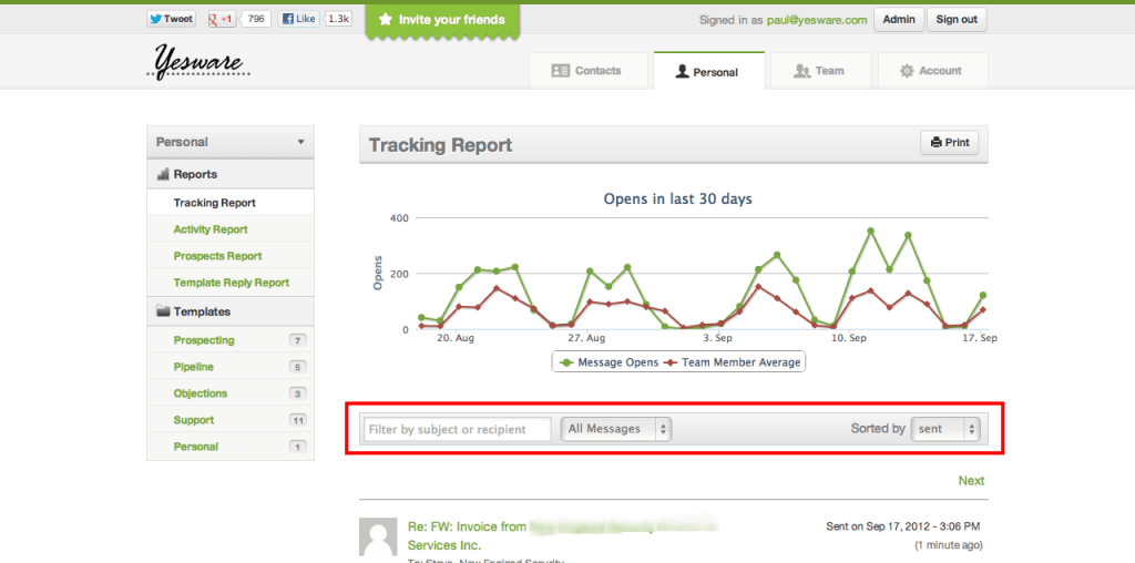 If you go to ‘My Yesware’ at the top of your Gmail window you will find your Tracking Report in the Yesware Application website. Here you are able to filter messages by subject or recipients that have been Opened/ Unopened, Clicked/ Not Clicked and Replied to/ Not Replied to. Additionally, if you’re not looking for anything specific you can do a quick sort by messages that have been Opened, Clicked and Replied.