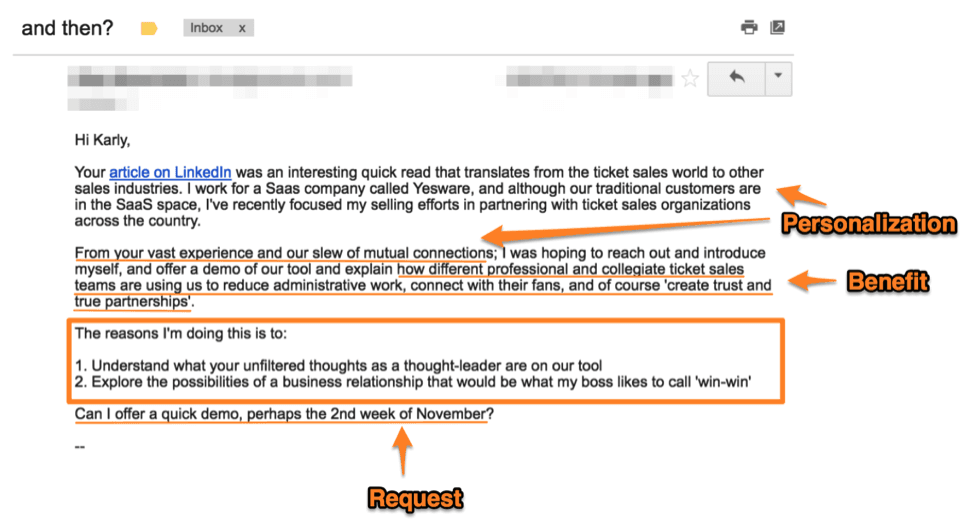 How to do it on your own: Find something that’s been bothering your prospect (ideally outside of work), then use a high-level connecting statement to tie it to a pain point on their team. Here, the connection is wasted time. In this case, it’s okay to ask for a meeting, because: