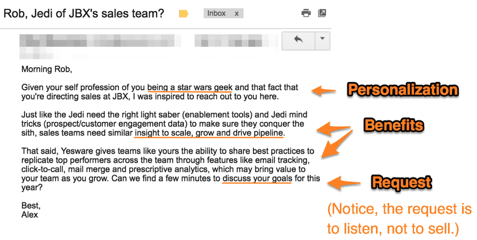 In the email below, a Yesware account executive adds two clear reasons for a meeting that help him transition from his Benefit to Request: