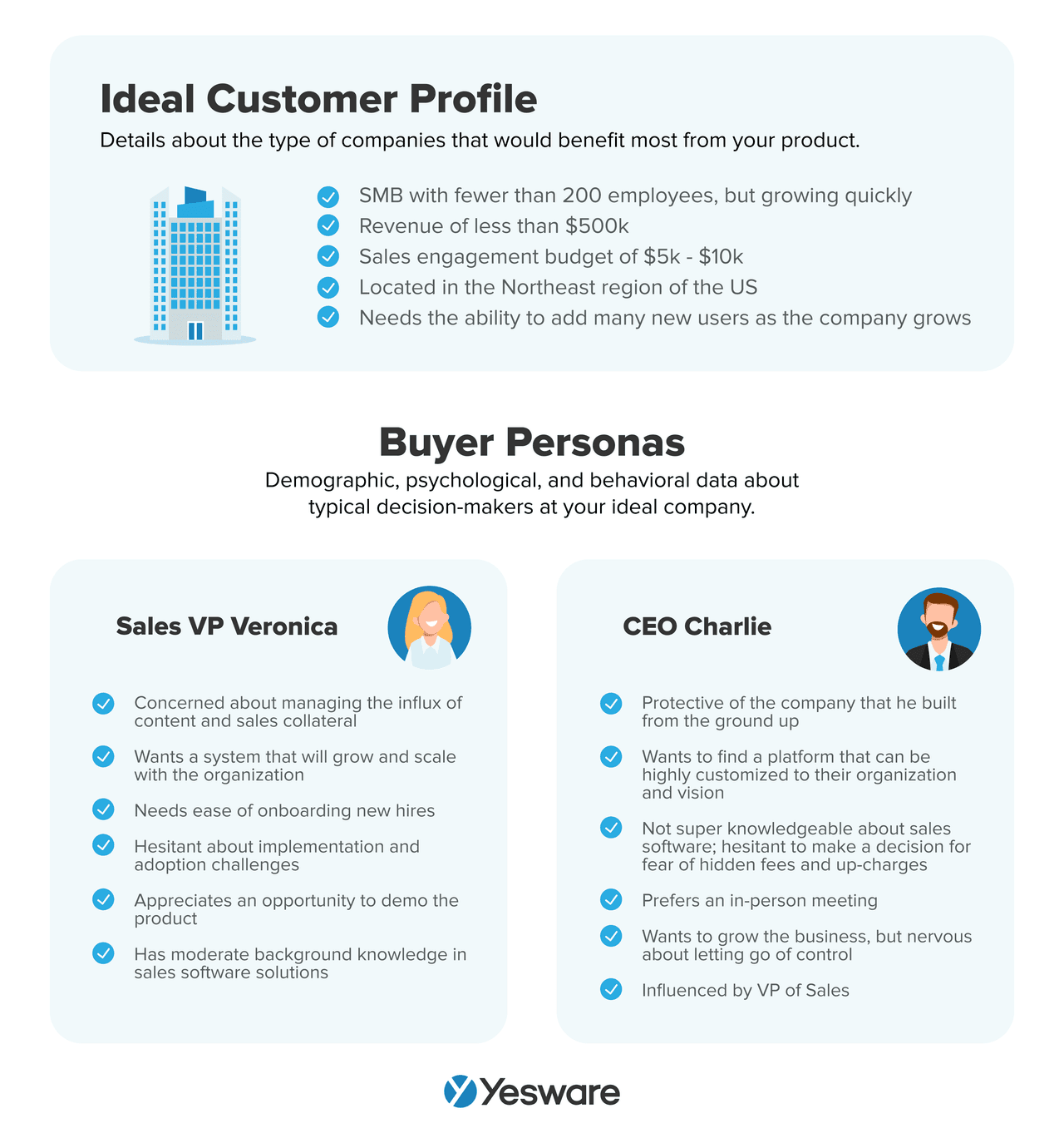 This kind of research can take a number of different forms. Ideally, sales reps will have an ideal customer profile (ICP) and buyer personas accessible for reference. These profiles will help sales reps plan each component of the sales conversation.
