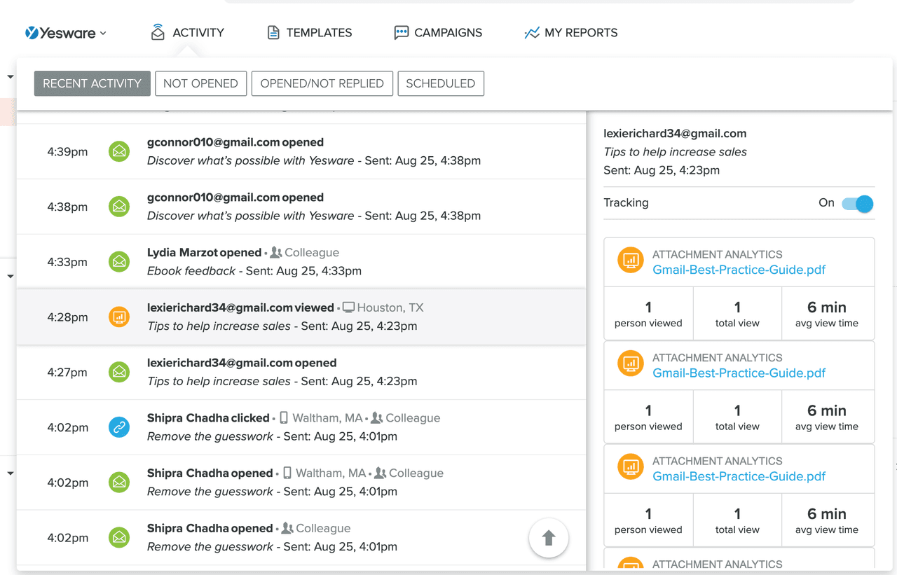 Yesware is sales engagement made easy, delivering real-time alerts to sales reps every time prospects open an email, read an attachment, or schedule a meeting with you.