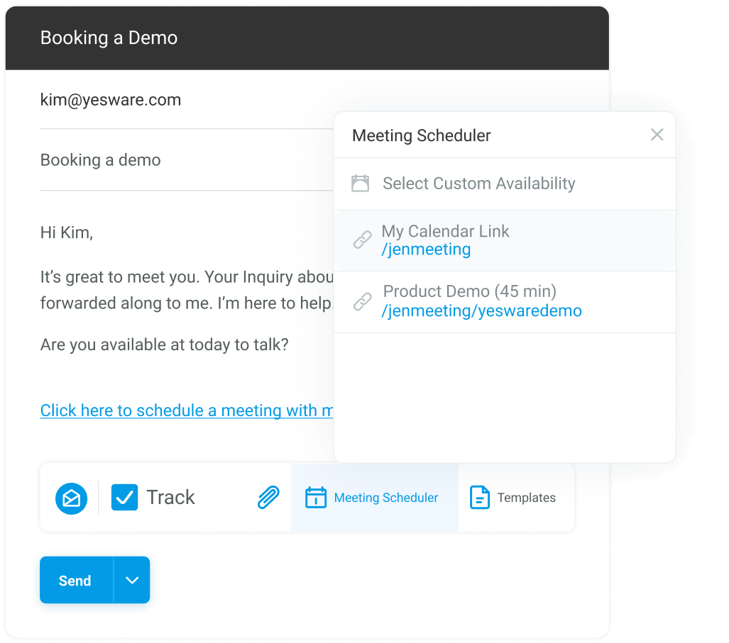Yesware’s Meeting Scheduler is the easiest way to book more meetings. Just set your availability and let recipients choose the perfect meeting time.