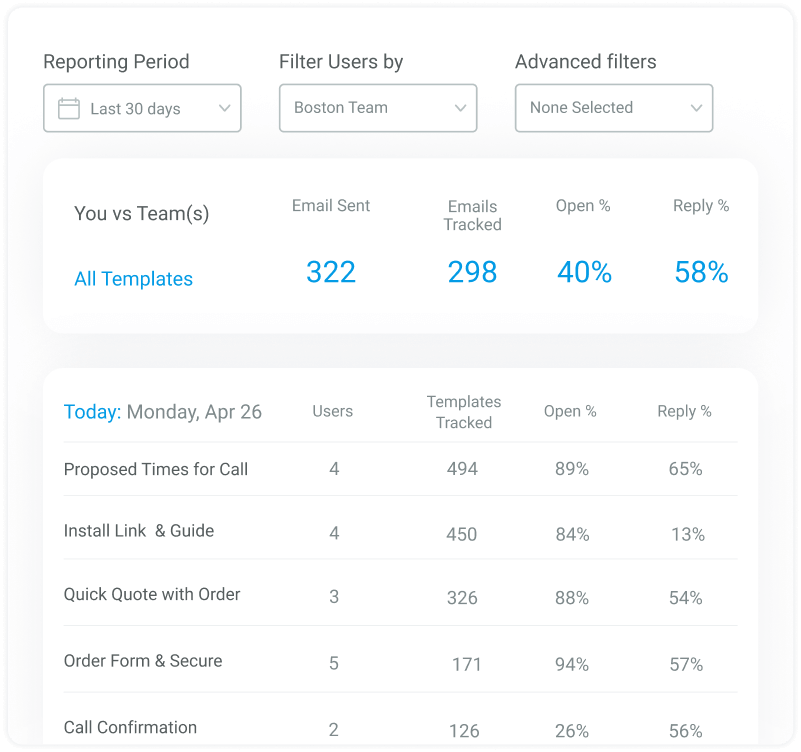 Uncover what’s working for your teammates. See open, reply and connect rates for all shared content.