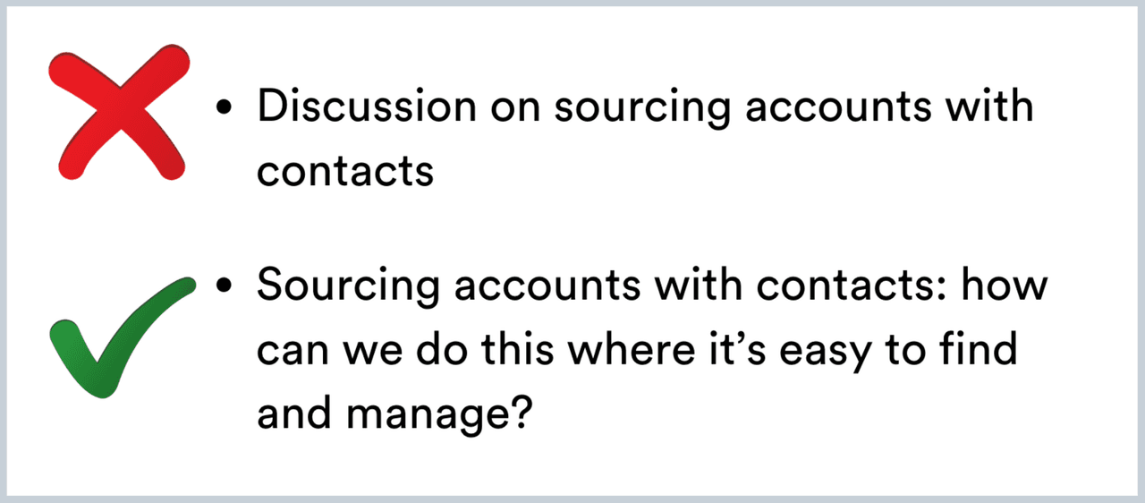 For agenda topics that aren’t assigned to an employee, but need to be addressed, try listing each as a question. In a Harvard Business Review study, they found that listing agenda topics as questions increases meeting productivity.