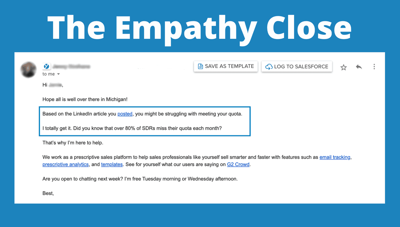 A report from Harvard Business School shows that empathy increases sales persuasion specifically when you show a prospect the utility in what you’re selling. By identifying concerns and going above and beyond to help solve their problems, you’ll earn your prospect’s respect.