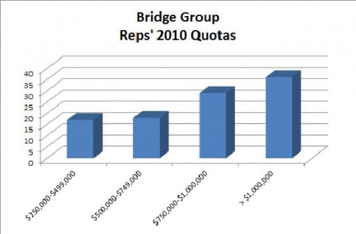 Having half the sales reps in the country is even more discouraging when you take into account the amount of money for which each person is accountable. According to the Bridge Group report, 36% of sales reps are responsible for quotas in excess of one million dollars, and the average annual quota per rep was $889,000, a 33% increase from the 2009 average of $716,000.