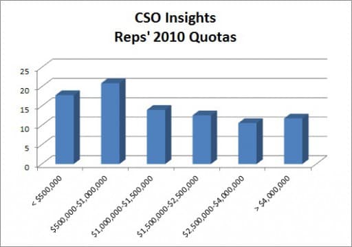 There is a disparity between SMB sales (small and medium businesses) focused and enterprise-focused sales reps, and those who focus on both SMB and enterprise with annual quotas of $791,000, $1,020,000, and $853,000 respectively. CSO Insights reports a similar distribution of average annual quota assignment per sales rep. According to their report, 17.8% of reps have quotas less than $500,000, 20.9% have quotas between $500,000 and $1,000,000, 14% have quotas between $1,000,000-$1,500,000, 12.6% have quotas between $1,500,000-$2,500,000, 10.6% have quotas between $2,500,000-$4,000,000, and 11.8% have quotas in excess of $4,000,000, with 10.8% reporting quotas not expressed in dollars.
